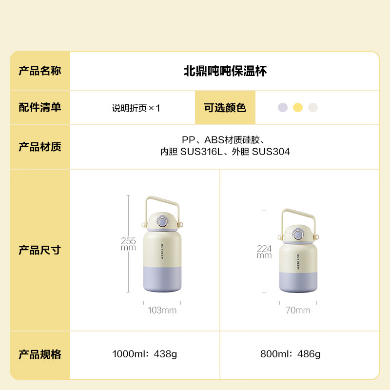 - 北鼎 S302吨吨保温杯1000ml 小鹅黄+背带套餐